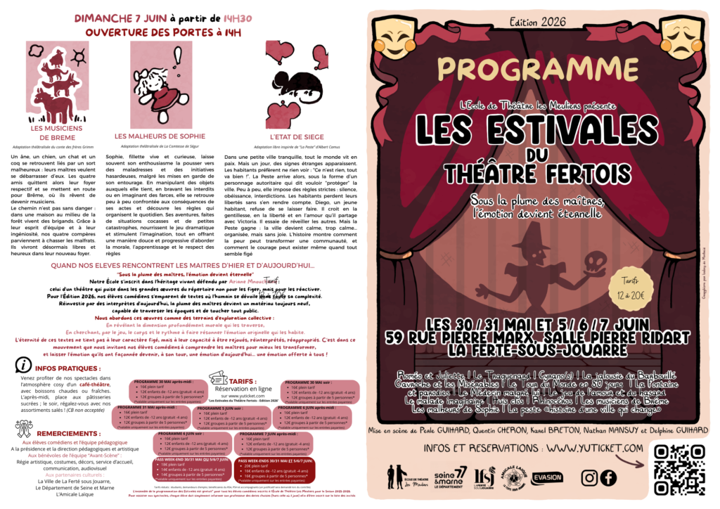 LES ESTIVALES DU THÉÂTRE FERTOIS, UNE SÉRIE DE REPRÉSENTATIONS PUBLIQUES OÙ NOS ÉLÈVES COMÉDIENS ENFANTS, ADOLESCENTS ET ADULTES PRÉSENTENT LE FRUIT DE LEUR TRAVAIL DE L’ANNÉE SUR LA THÉMATIQUE « SOUS LA PLUME DES MAÎTRES, L’ÉMOTION DEVIENT ÉTERNELLE ».